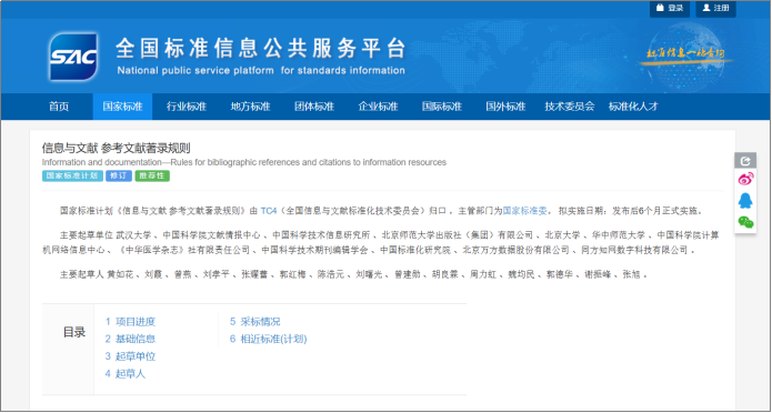 国家标准《信息与文献 参考文献著录规则》 由TC4(全国信息与文献标准化技术委员会)归口 ,主管部门为国家标准委。