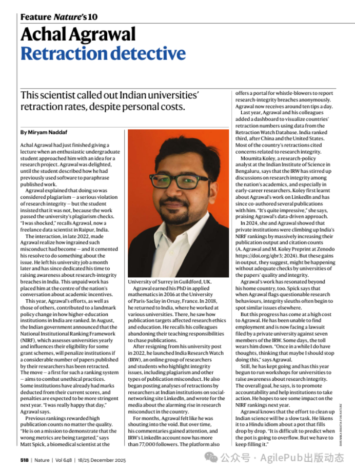 继俄罗斯科研侦探Anna Abalkina入选《自然》2024年度十大人物后,印度科学家Achal Agrawal因不惜付出个人代价,勇于揭露印度大学的撤稿率而入选《自然》2025年度十大人物。