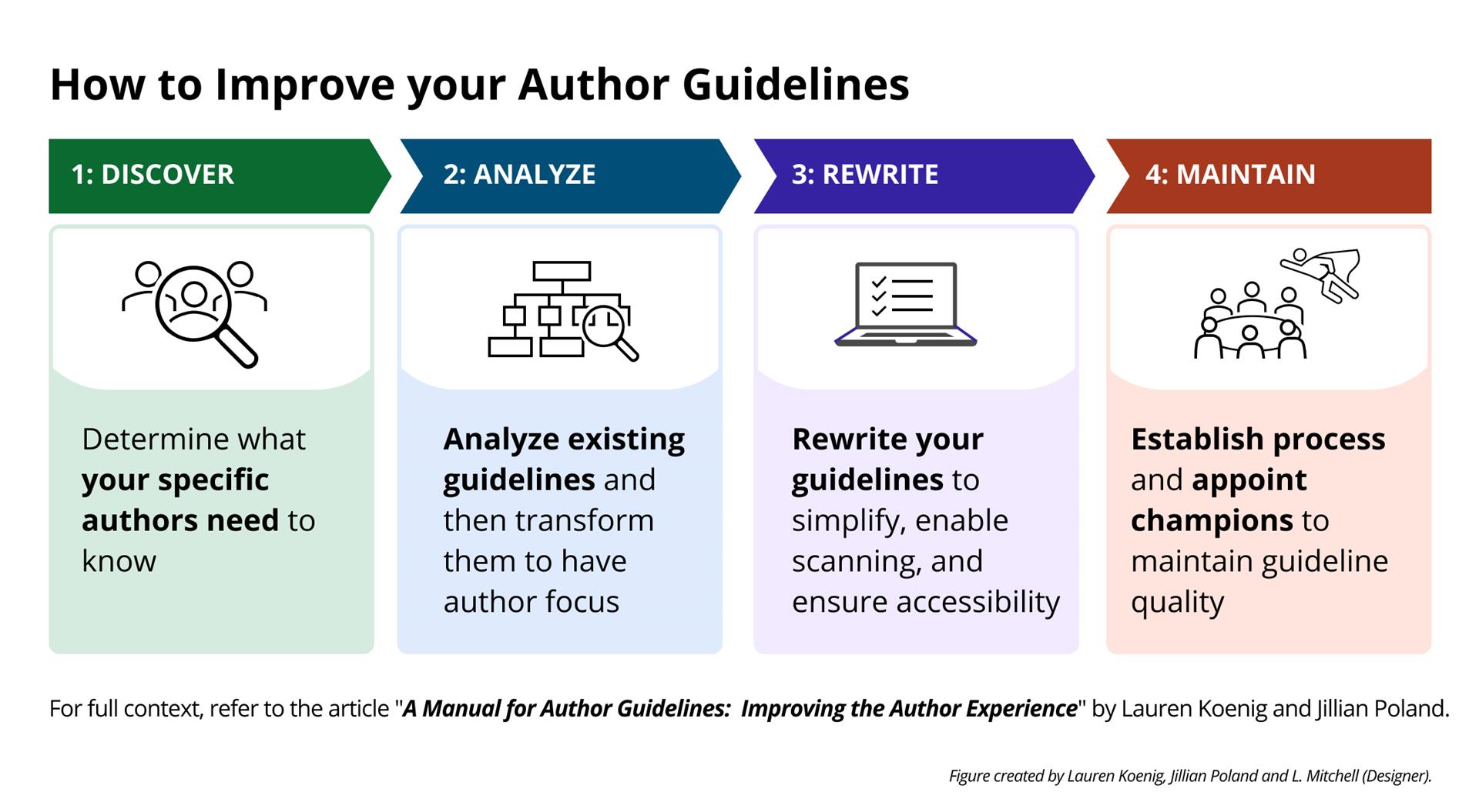 ·帮助作者只关注他们需要的信息。在组织指南时,要考虑作者不同的经验水平和投稿需求。一种方法是应用信息觅食理论的原则,该理论表明人们寻找信息的方式类似于动物觅食——他们希望以最小的努力找到有价值的信息。