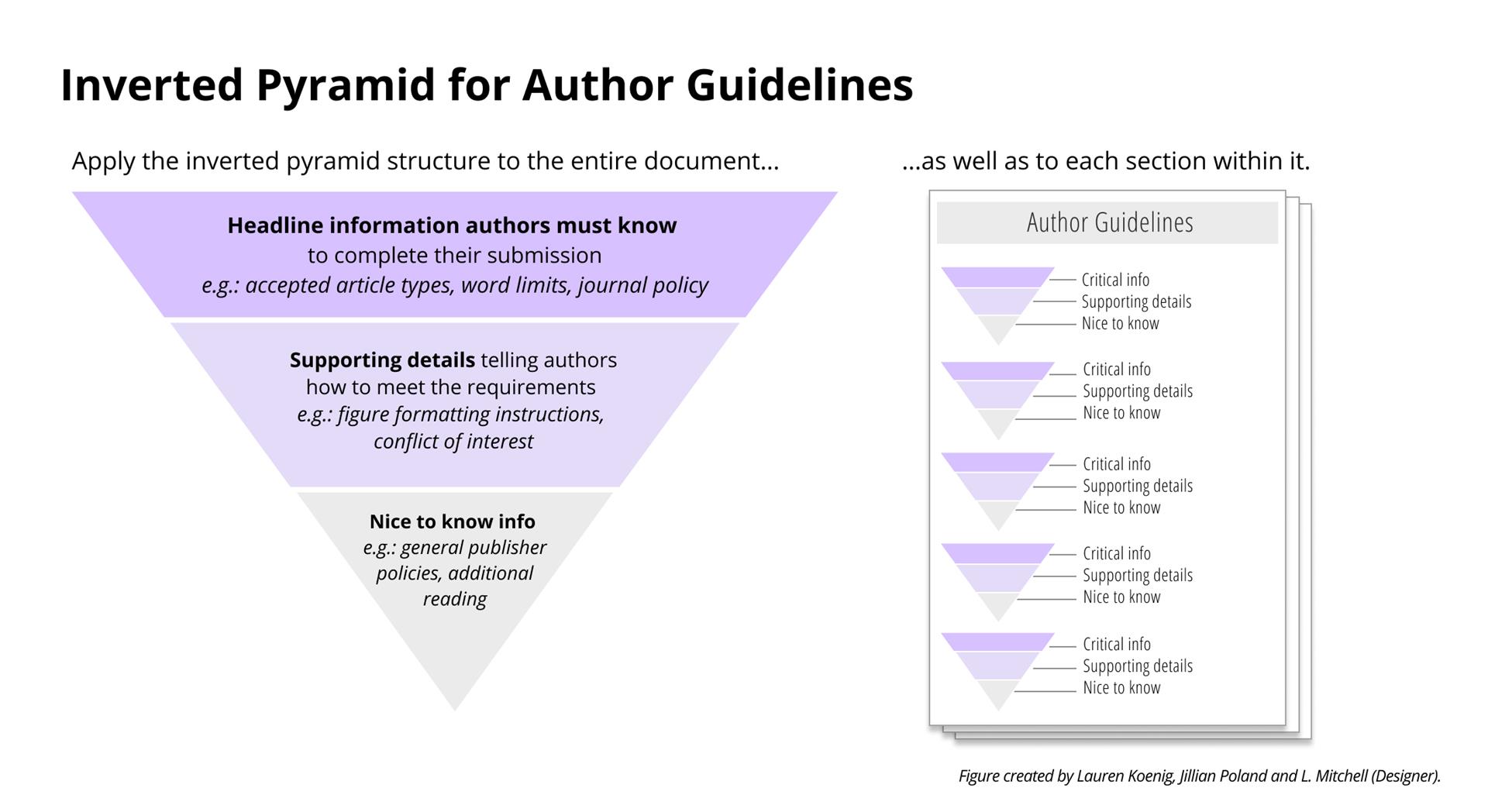 ·使用倒金字塔写作风格。按重要性顺序呈现信息,从最关键的细节开始。这有助于作者判断其稿件是否符合基本标准。然后,再介绍稿件准备或录用后的细节。你也应在各个章节内部应用此模式,首先突出说明每项政策最重要的部分,然后是具体细节,如任何背景信息或分步说明。