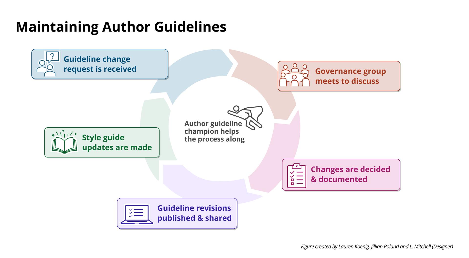 ·成立治理小组。一个由主题专家组成的治理小组可以就指南的方向提供咨询,并确定是否需要更改,助于保持指南与共同目标一致。小组成员应代表关键利益相关者,如执行编辑、主编和副编辑。较大的组织可能还包括项目经理以及来自法律和研究诚信部门的代表。