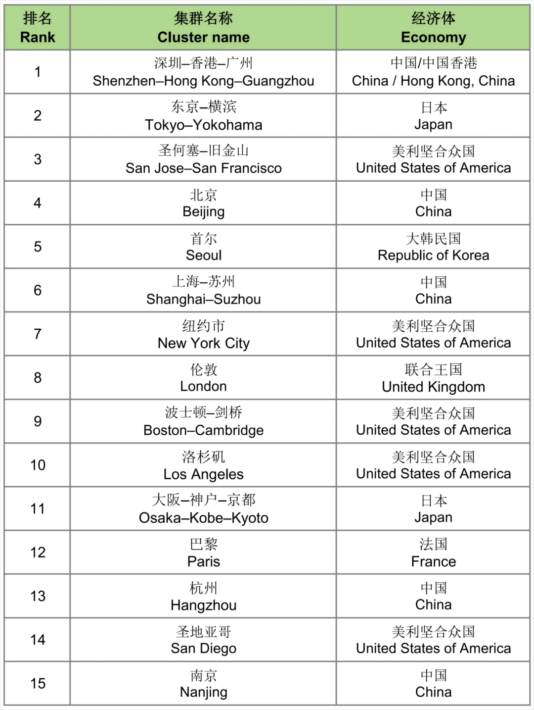 二是创新集群数量排名全球第一。中国共拥有24个全球百强创新集群,其中深圳—香港—广州集群排名首次跃居全球之首,北京(第4位)、上海—苏州(第6位)集群位居前十,是全球专利申请、科技创新及创业投资的热点区域。