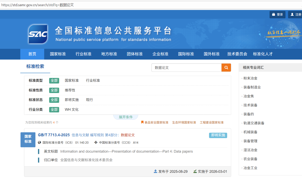 2025年8月29日,国家市场监督管理总局、国家标准化管理委员会发布“2025年第21号中国国家标准公告”,批准发布《包装储运图形符号标志》等622项推荐性国家标准和6项推荐性国家标准修改单。其中,GB/T 7713.4—2025《信息与文献 编写规则 第4部分:数据论文》于2026年3月1日实施。