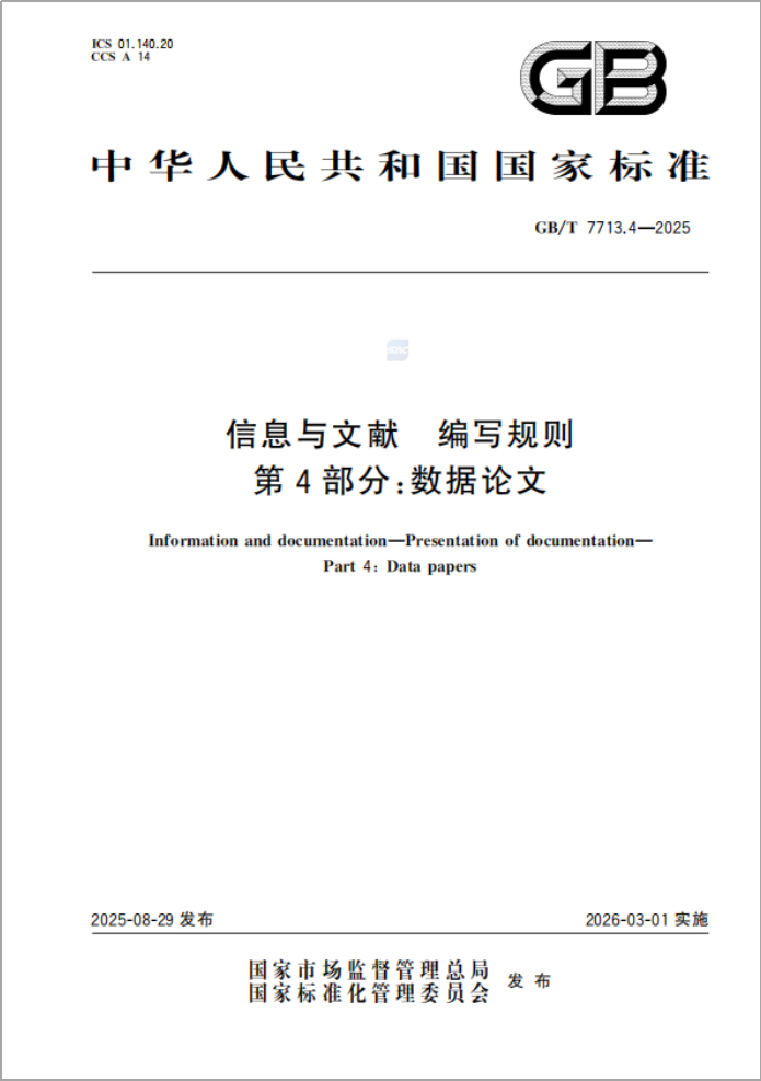 国家标准GB/T 7713.4—2025《信息与文献 编写规则 第4部分:数据论文》发布