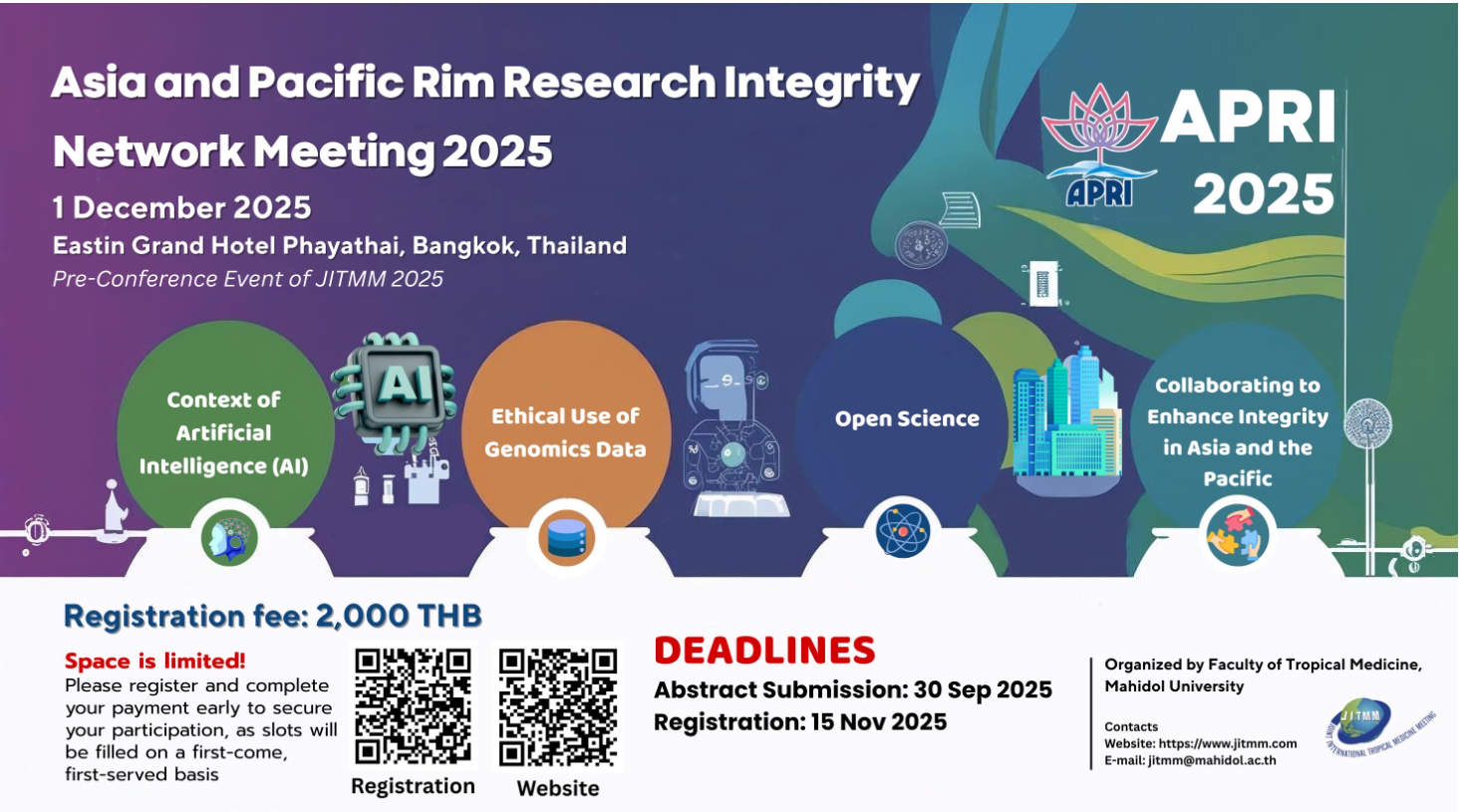 2025年亚太科研诚信网络会议(Asia and Pacific Rim Research Integrity Network Meeting, 简称APRI)将由曼谷玛希隆大学热带医学院主办,于2025年12月1日在泰国曼谷帕亚泰易思廷大酒店(Eastin Grand Hotel Phayathai)举行,作为2025年国际热带医学大会(JITMM 2025)的会前活动。