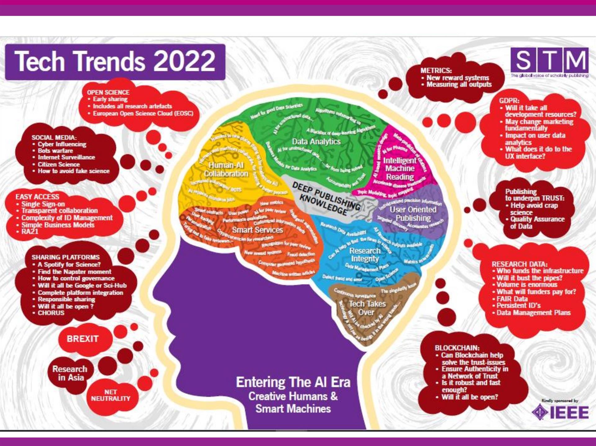 STM 协会发布的 Tech Trends 2022信息图以“人机共创”为核心隐喻,用一幅人脑地图勾勒出未来科研与出版的关键趋势。中央“深度出版知识(Deep Publishing Knowledge)”区块,连接着人类创造力与智能机器的协作,象征着出版业正在全面迈入人工智能驱动的时代。