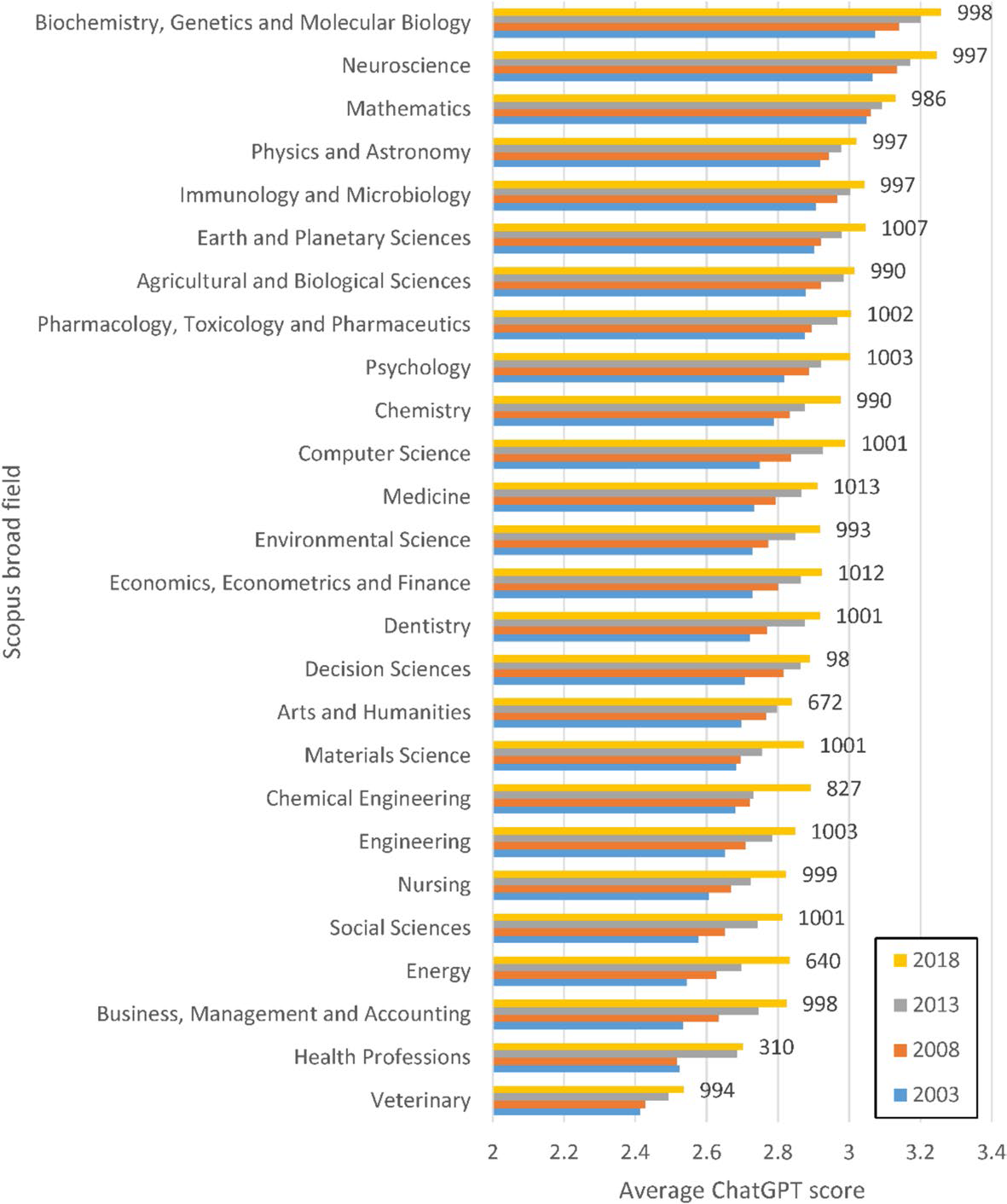图1 各学科领域不同发表年份论文的ChatGPT平均得分