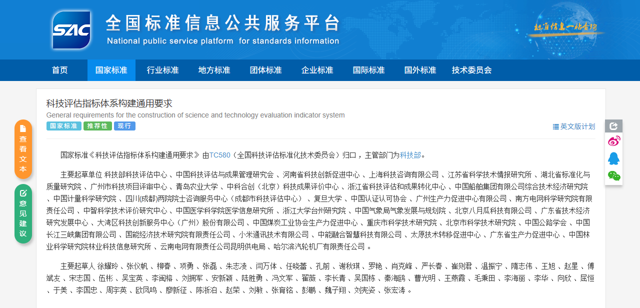 《科技评估指标体系构建通用要求》确立了科技评估指标体系构建的总体原则,规定了指标体系构建的需求与影响因素分析、指标体系结构和指标设计、指标体系应用方法等方面的要求。该标准的发布和实施有利于指导和规范科技评估人员科学高效地开展评估工作,同时便于委托者、被评对象、用户等利益相关方准确理解指标、有效参与评估活动和应用评估结果,提高科技评估活动规划设计和组织实施的质量和效率,推动科技评估行业专业化发展。