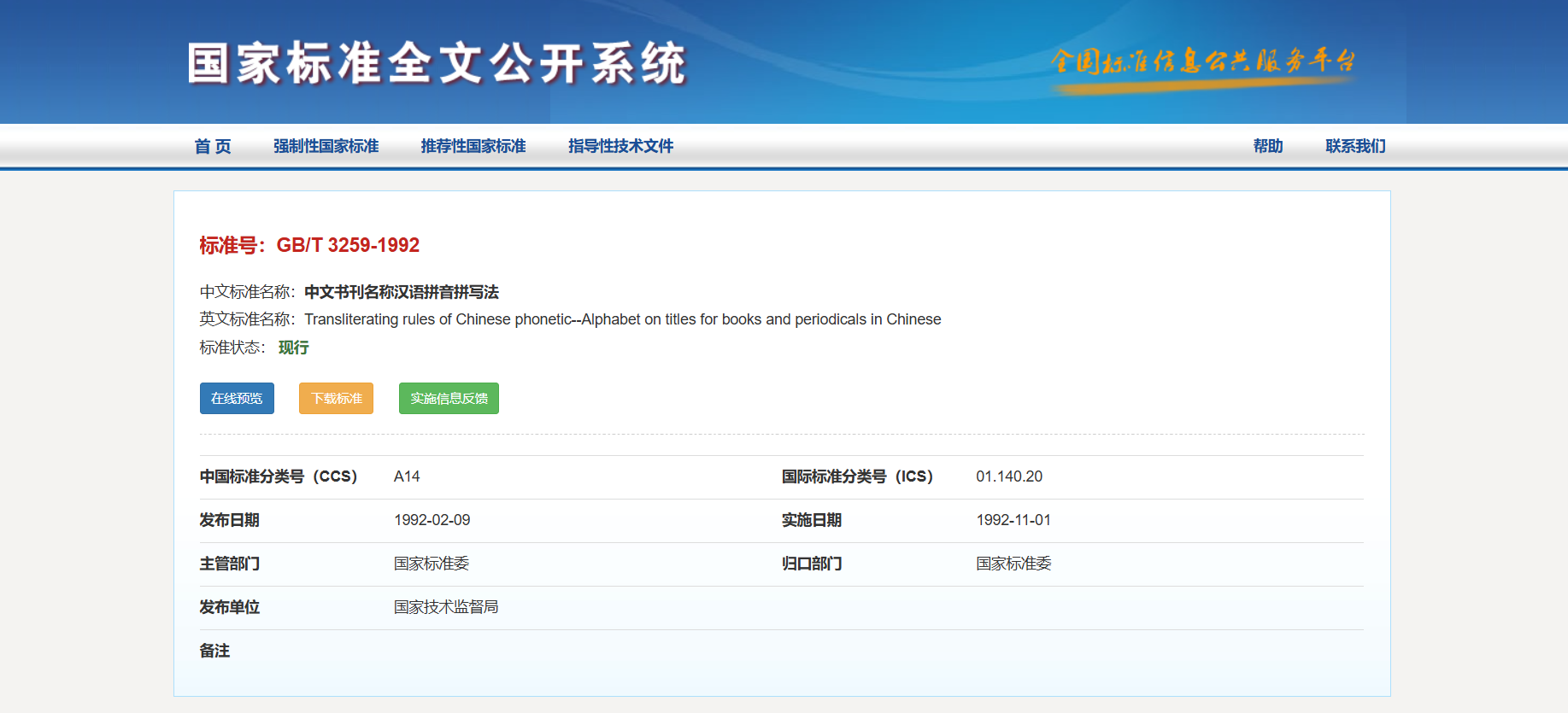 中文书刊名称汉语拼音拼写法:GB_T 3259—1992