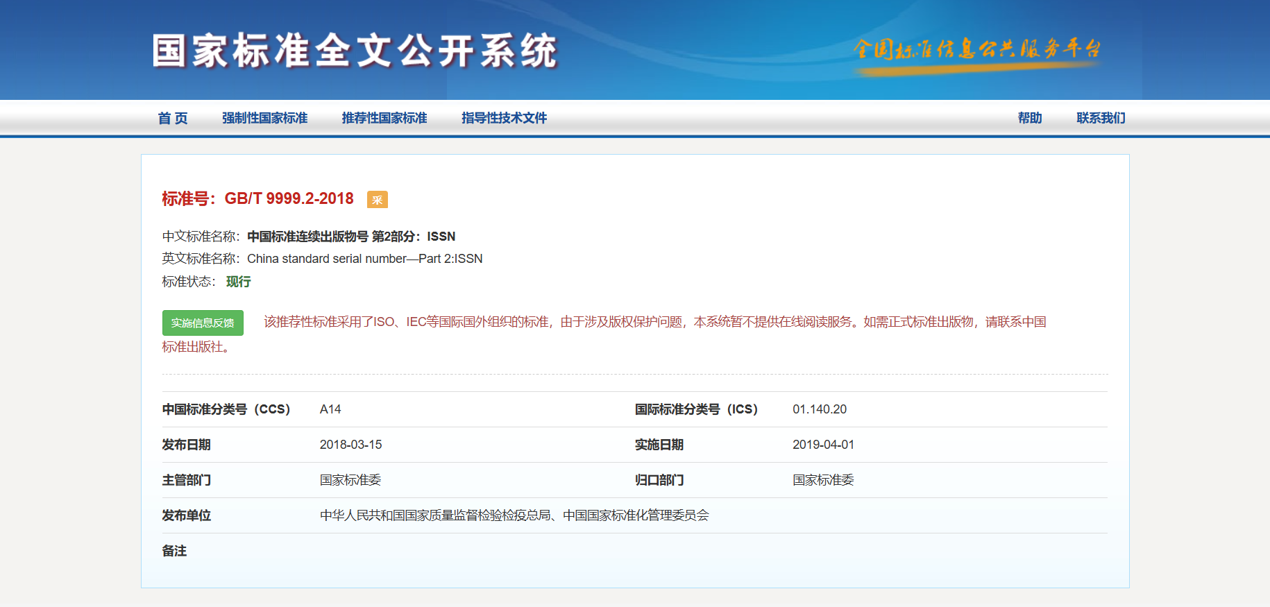 中国标准连续出版物号 第2部分:ISSN GB_T 9999.2—2018