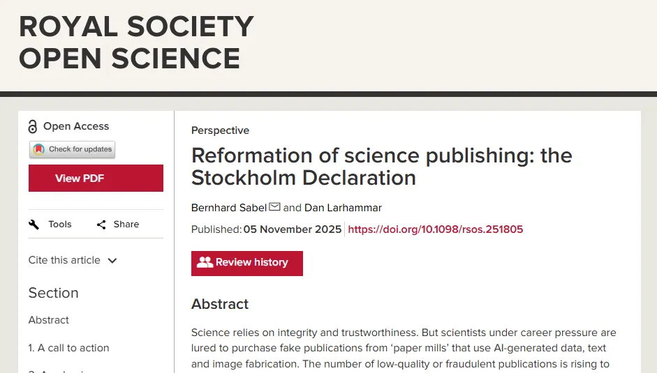 11 月 5 日,由包括中国学者在内参与起草的《科学出版改革:斯德哥尔摩宣言》(Reformation of science publishing: the Stockholm Declaration,以下简称《宣言》),在国际学术期刊《英国皇家学会开放科学》(Royal Society Open Science)正式发布。该宣言旨在呼吁对科学出版体系进行根本性改革,以应对日益严峻的学术不端行为,并推动科研诚信体系重建。