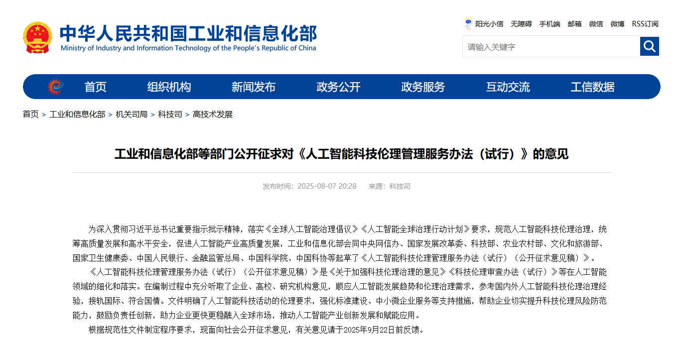 工业和信息化部等部门公开征求对《人工智能科技伦理管理服务办法(试