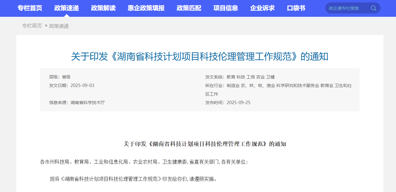 关于印发《湖南省科技计划项目科技伦理管理工作规范》的通知