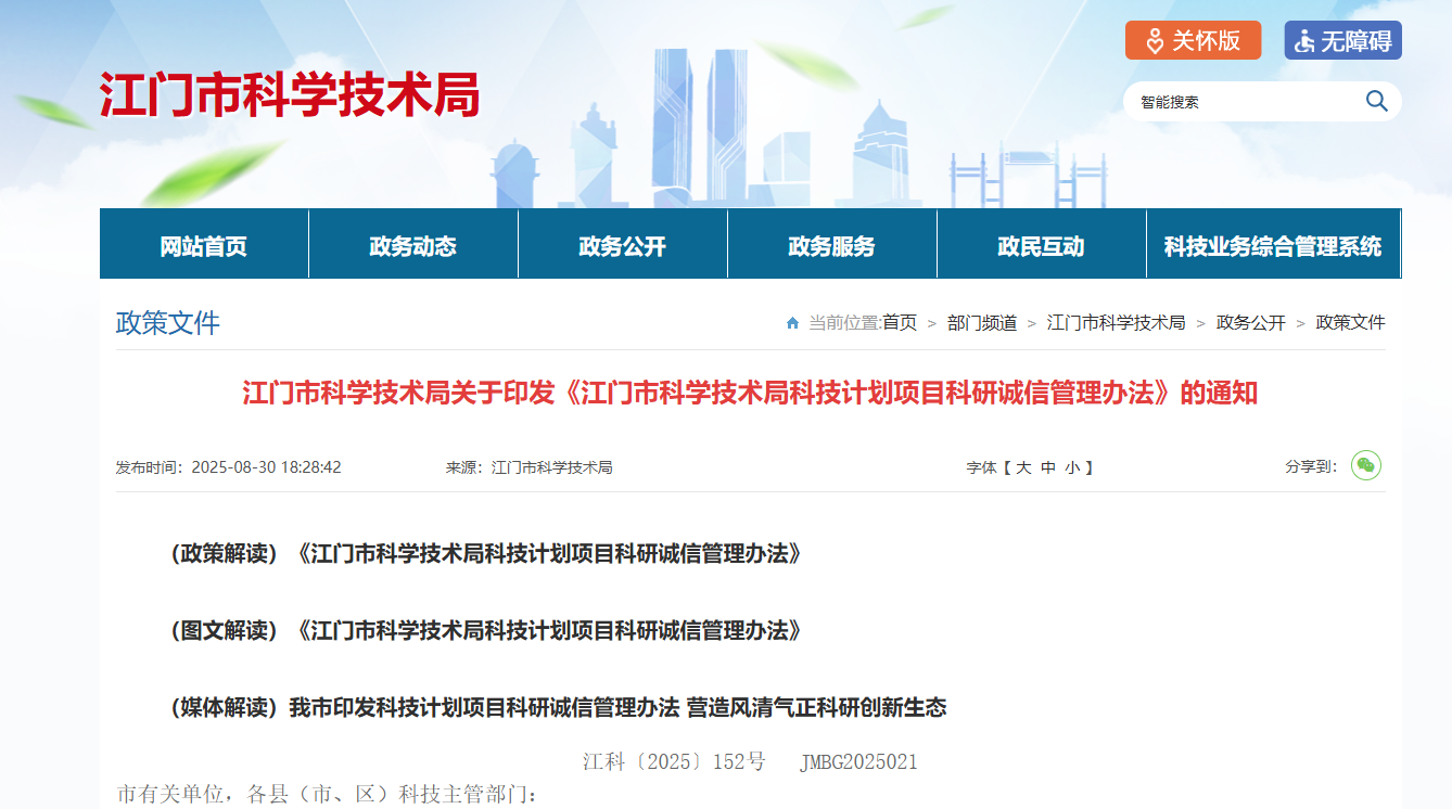 为完善科技创新治理体系,加强科研诚信建设,规范科研诚信管理,根据国家、省有关规定,我局制定了《江门市科学技术局科技计划项目科研诚信管理办法》,现印发给你们,请遵照执行。如在执行过程中遇到问题,请及时向我局反映。
