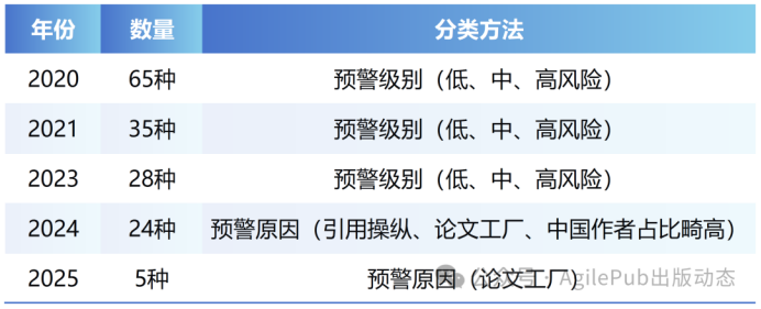 中国科学院文献情报中心期刊分区表团队,自2020年起面向社会公开发布“国际期刊预警名单”,目前已发布5期,预警期刊入列数量及原因如下。